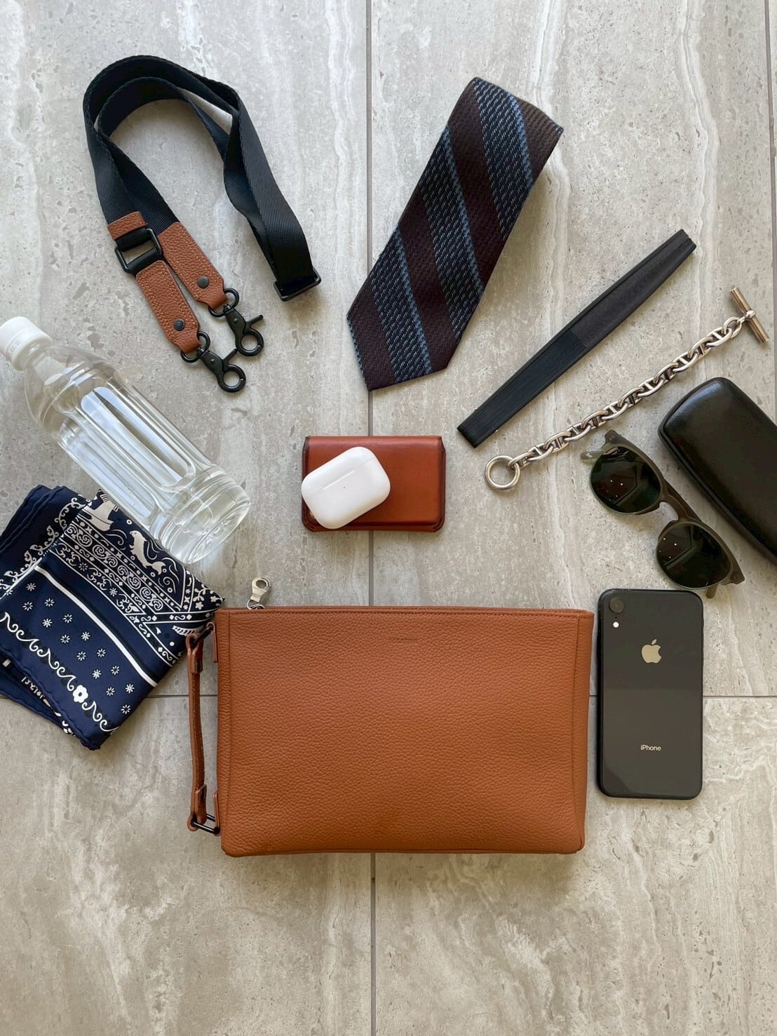 シュリンク調の肉厚のレザーはツヤも抑えて高級感のある仕上がりになっております。スッキリとしたデザインですが、長財布も収納可能で、背面のポケットにはスマホなども収納できます。また最大の特徴は、サイドにハンドルが付いていることで、セカンドバッグ・手持ち・ショルダーの3WAYで御使用頂けます。